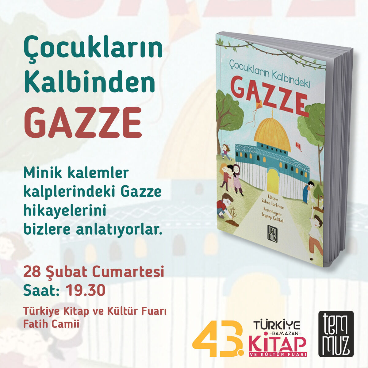 Gazze’de yaşananlara çocukların saf ve umut dolu penceresinden bakan anlamlı bir çalışma, okurlarıyla buluşmaya hazırlanıyor. Temmuz Kitap etiketiyle raflardaki yerini alan “Çocukların Kalbindeki Gazze” kitabının çocuk yazarları, 43. Türkiye Kitap ve Kültür Fuarı kapsamında düzenlenecek özel bir söyleşide bir araya geliyor.